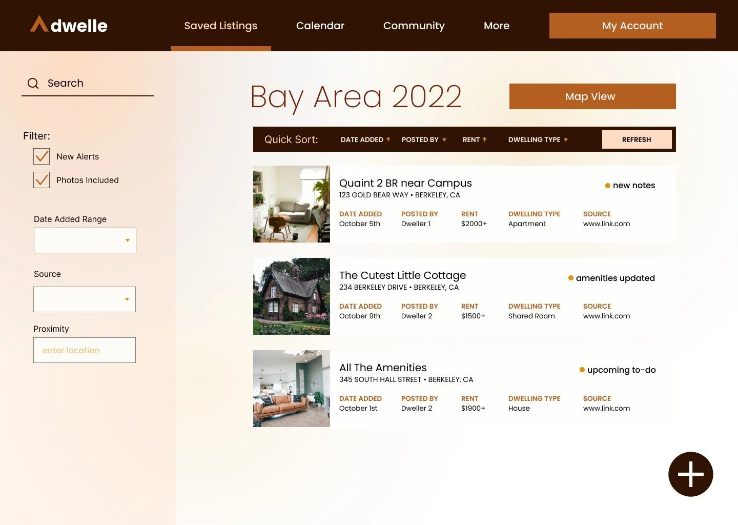 Through the key insights we drew from the interview process, we found an opportunity to help streamline the housing search process by creating an in-browser web tool to organize the search process with three primary features: